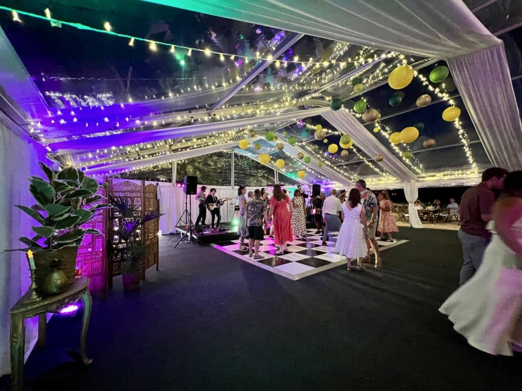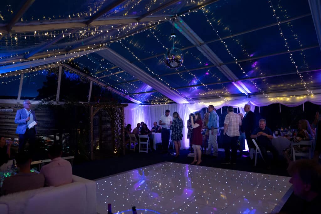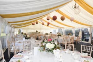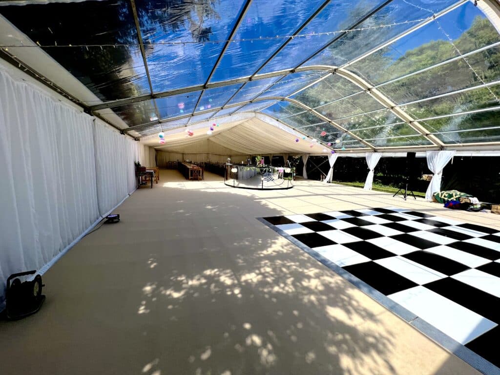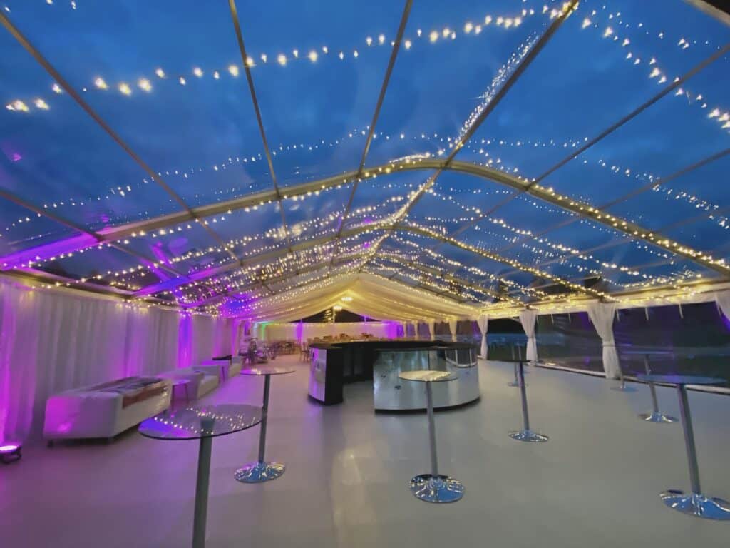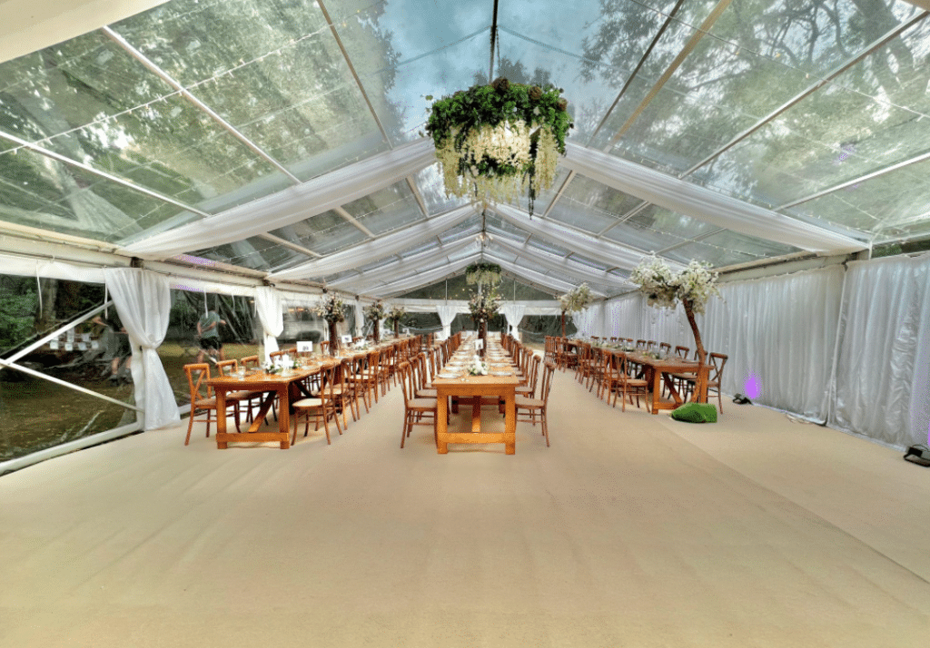 Transparent roofs do not have lining installed on the interior. This means the roof beams & legs (metal structure) within the marquee is visible. To reduce the industrial look of a transparent marquee, white lining overlays, swags & leg covers can be installed above to soften the look.