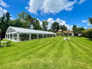 Can either be configured where the complete marquee roof is transparent or just part of the marquee roof is transparent. Can have clear walls & gable ends clear too.